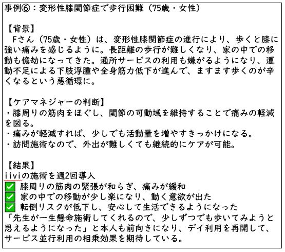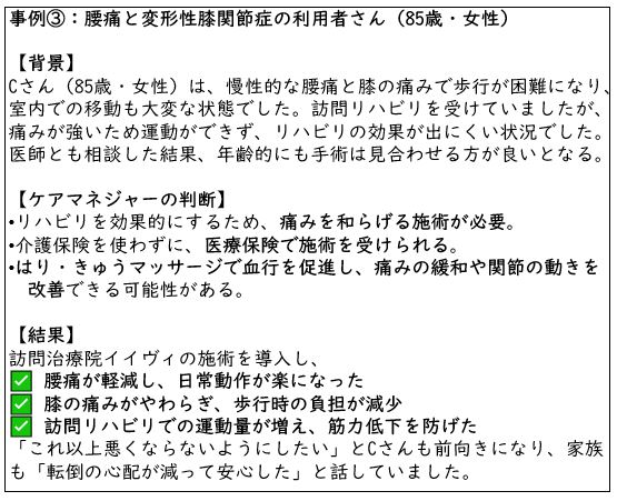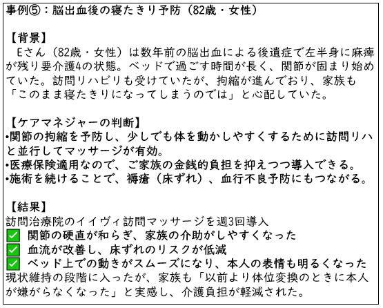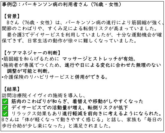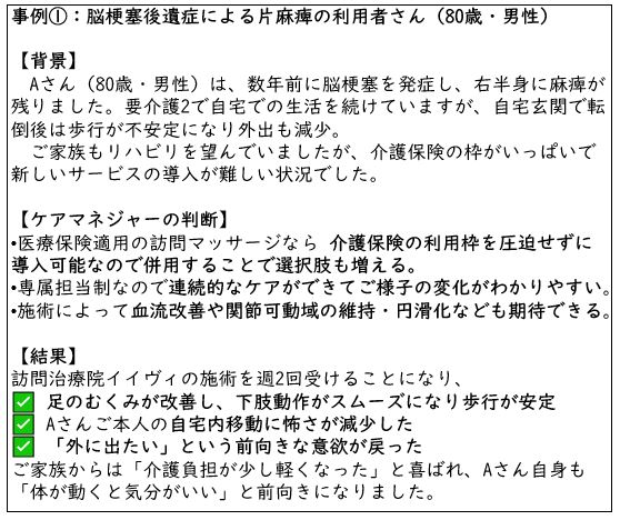 導入事例 ご本人様やご家族様からのお申込みだけでなく、ケアマネージャー様から担当ご利用者様へのサービス導入紹介の場合もございますので一例を紹介差し上げます。 施術効果に関しては個人差がありますので予めご承知おきください